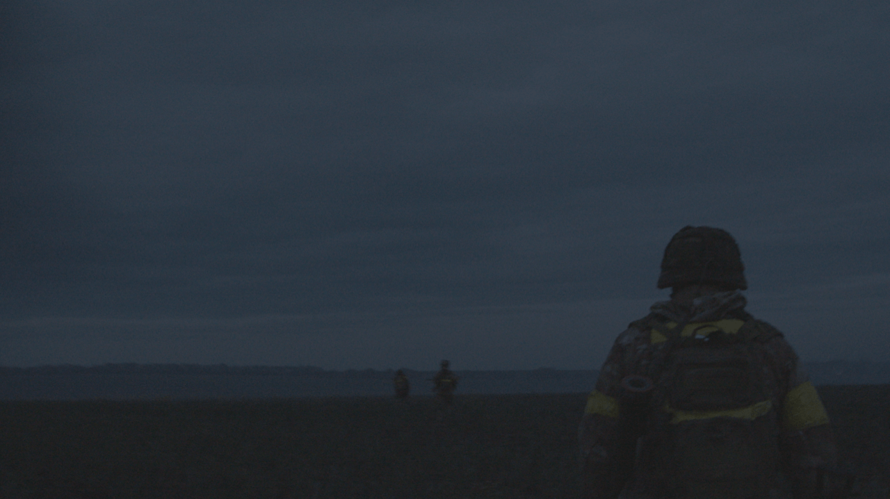 Still from Frontline. It is evening as a group of soldiers go through a meadow. The camera is placed behind them and we see the backside of a soldier in the foreground. Two additional soldiers are seen out of focus in the background.