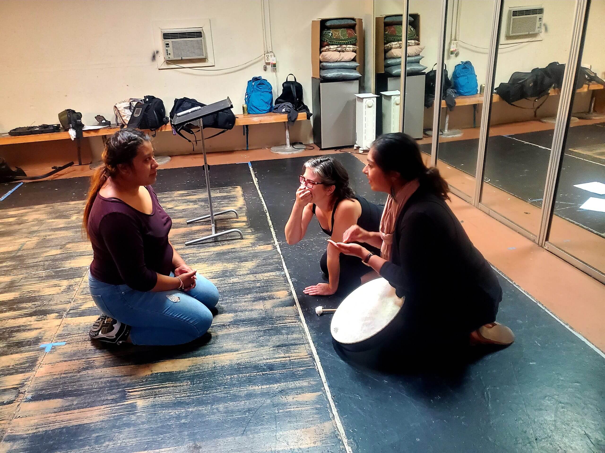 Production still from Fruits of Labor. Film protagonist, Ashley, is sitting across from film director, Emily Cohen Ibanez, and another woman who has a hand drum leaning against her knees.