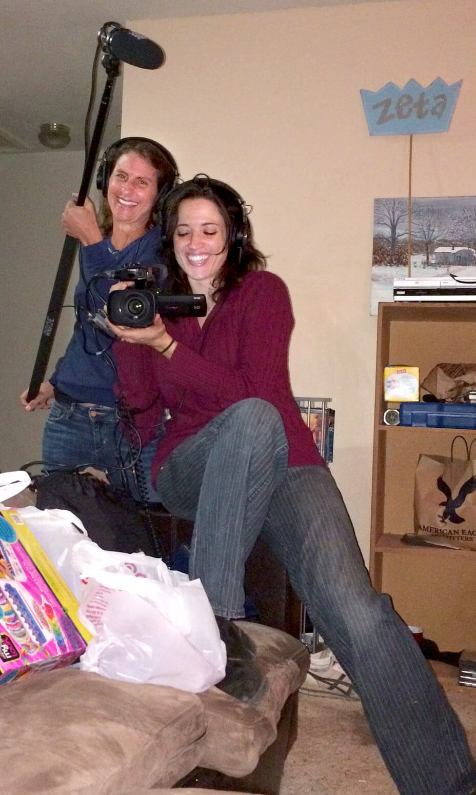 Production still from Hot Girls Wanted. Ronna Bradus is leaning against the arm of a couch, holding a camera up to her chest, filming. Behind her, Jill Bauer is holding up a boom microphone above her. They are both wearing headphones.