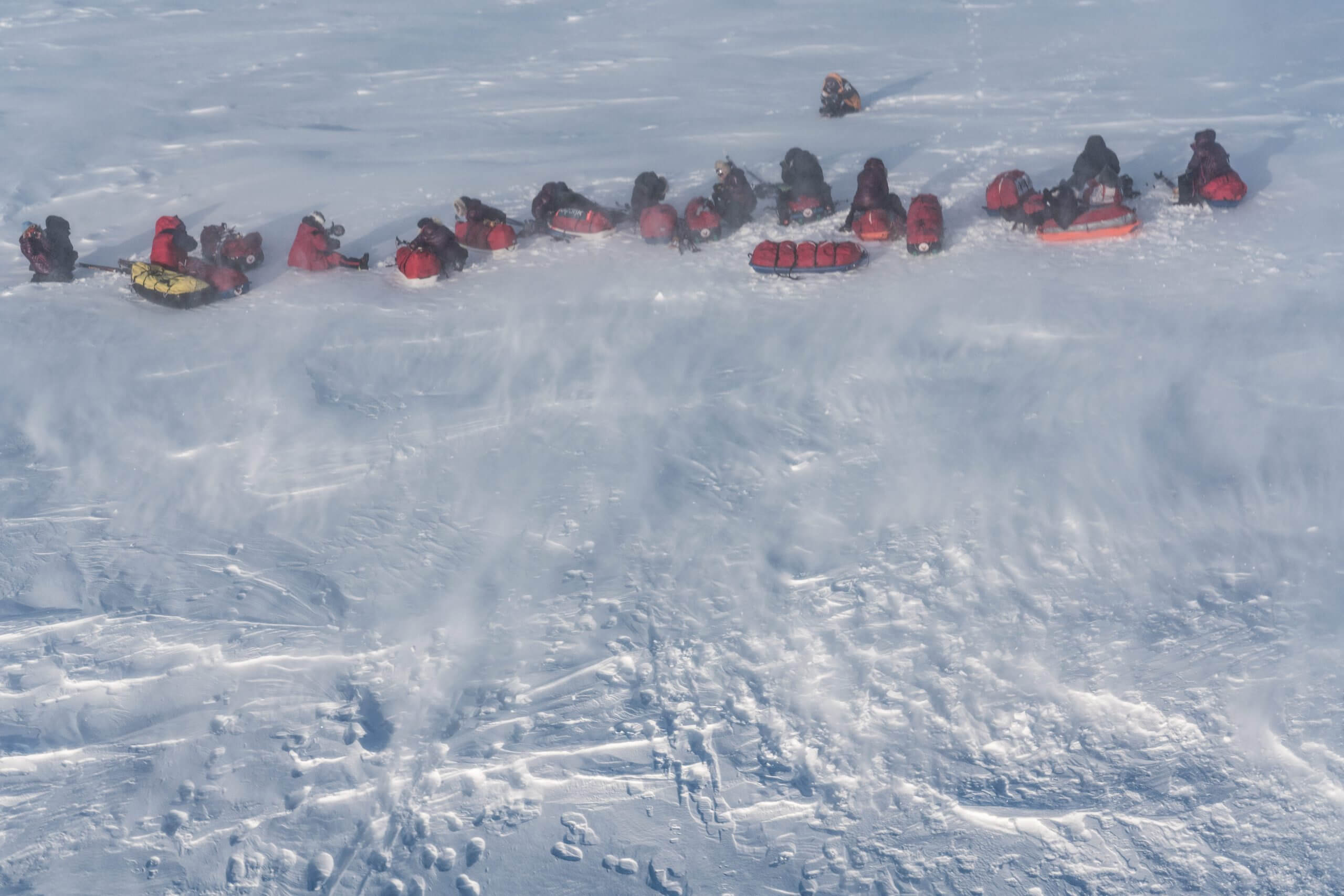 Overexposed_Production Still_The final view of the team from the Mi-8 as the helicopter rotor wash covers them in a dusting of snow and ice Photo by Renan Ozturk
