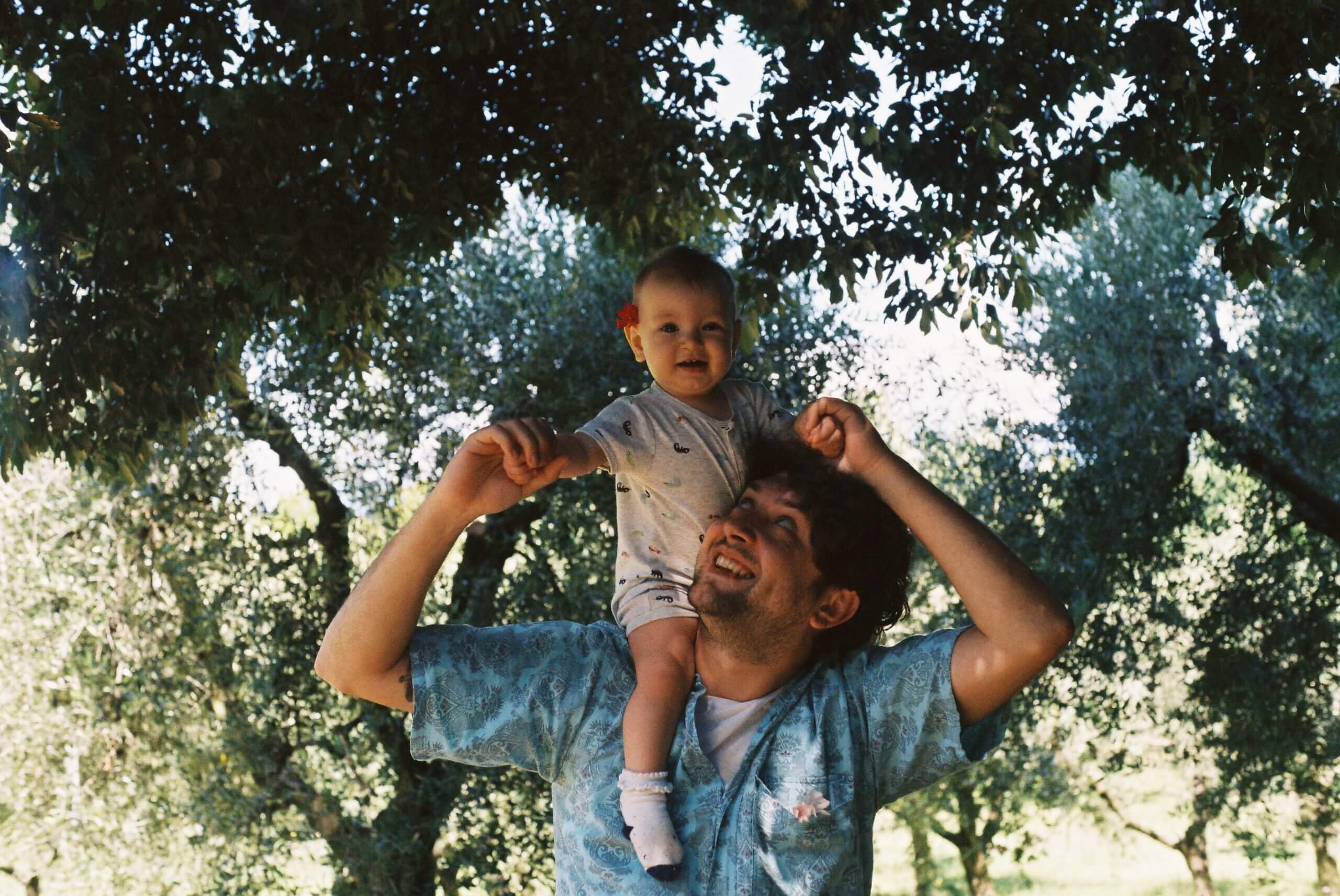 A man with a short sleeve shirt has a baby on his shoulders, he looks at her, the baby has a flower behind her ear and looks giggly at the camera