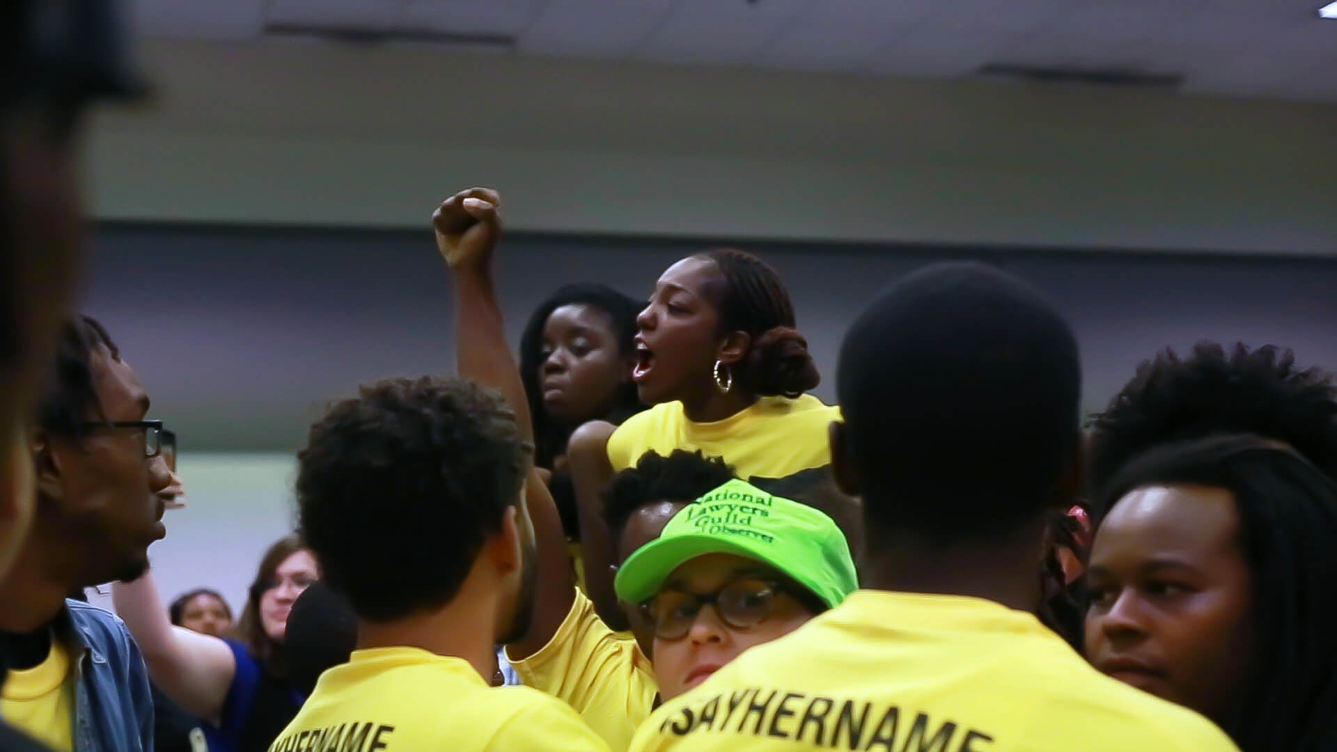 Still from Unapologetic. People gathered, wearing yellow shirts, and one of them has their fist up in the air. A woman stands out from the crowd.